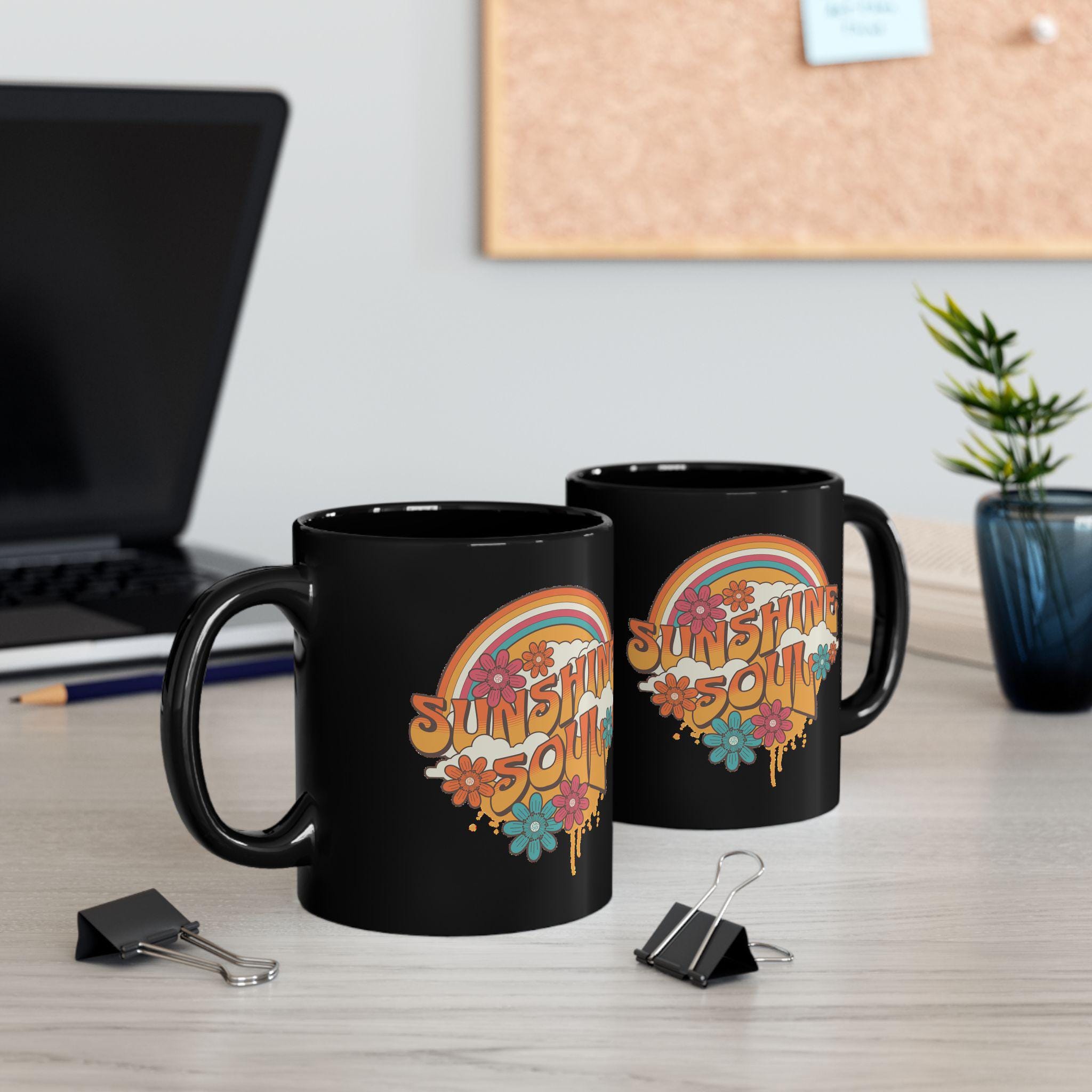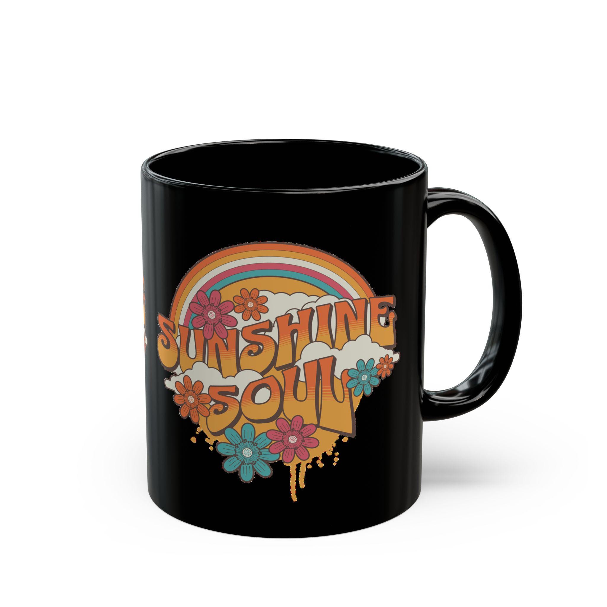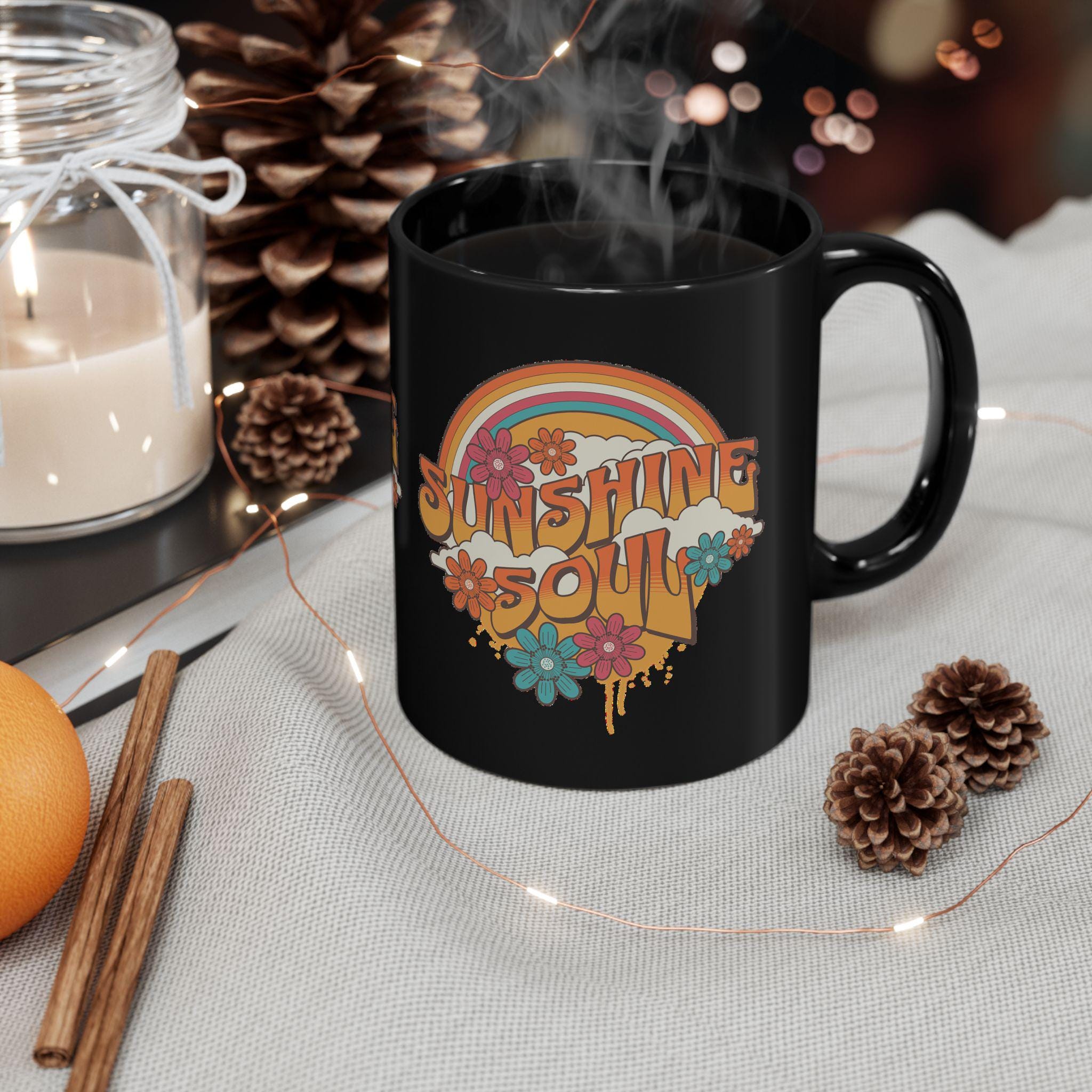 This glossy black ceramic mug carries a warm, retro heart — a sunlit rainbow, layered florals, and bold, sun-faded lettering that reads like a friendly morning whisper. It feels like slow mornings on the porch, vinyl records spinning, and a favorite playlist that always lifts your mood. The deep black canvas makes the sunset colors pop, giving every sip a small, joyful ritual. Durable and easy to care for, it slips into daily routines: brewing coffee, steeping tea, or holding a cozy cocoa while you plan the day. The handle sits comfortably in hand and the weight of the ceramic feels reassuring — a little object that brings color to gray mornings and reminds the drinker to carry a bit of sunshine with them.