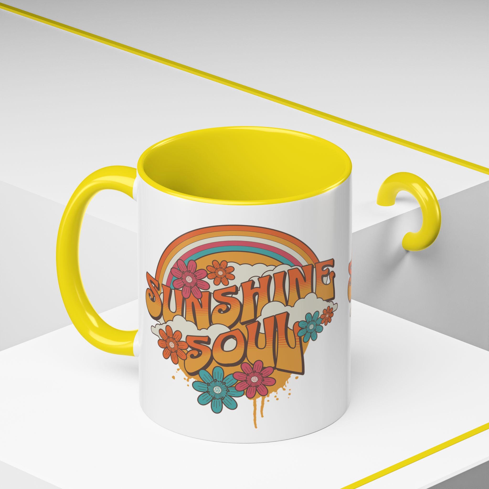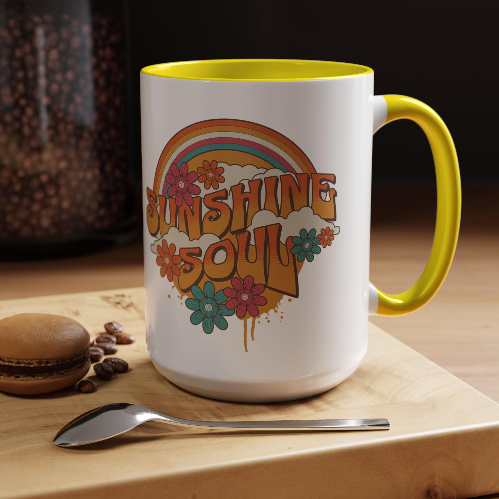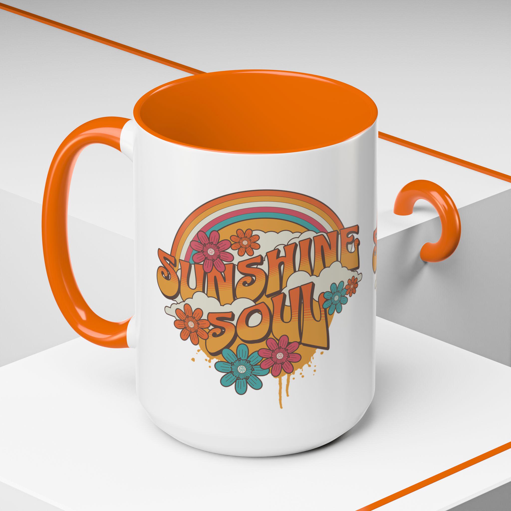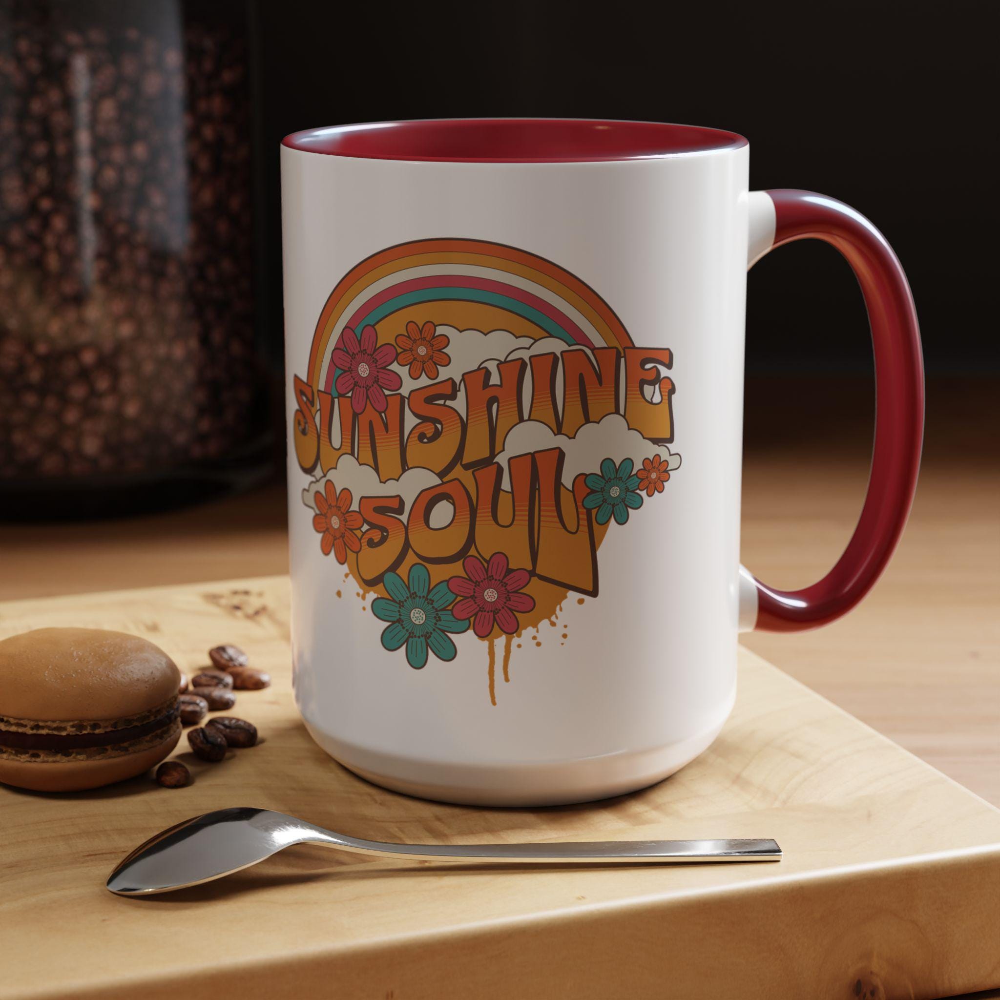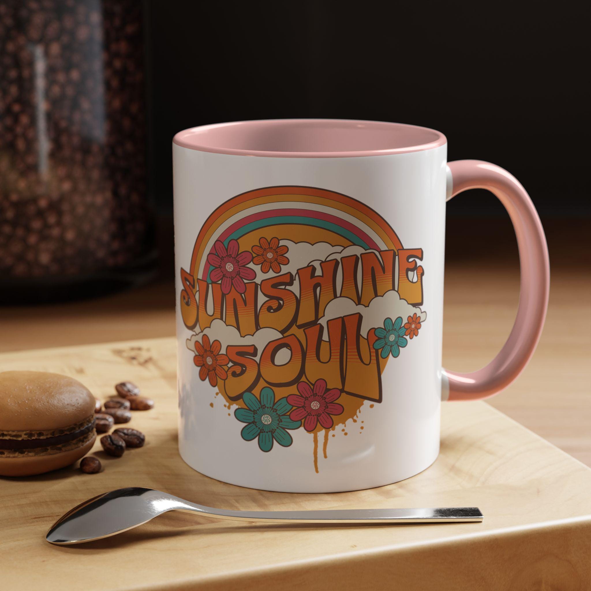 Bright, cheerful ceramic mug designed to start mornings with a retro, sun-soaked vibe. The glossy white exterior contrasts with a soft pink interior and handle, framing a playful 70s-inspired “Sunshine Soul” graphic complete with rainbows and floral accents. It feels like a little pocket of optimism — warm coffee, tea, or cocoa tastes sweeter when sipped from a cup that looks like a sunny playlist and a summer afternoon rolled into one. Durable enough for daily use, it holds either 11 or 15 ounces and stands up to microwave and dishwasher routines without losing its vibrant colors.