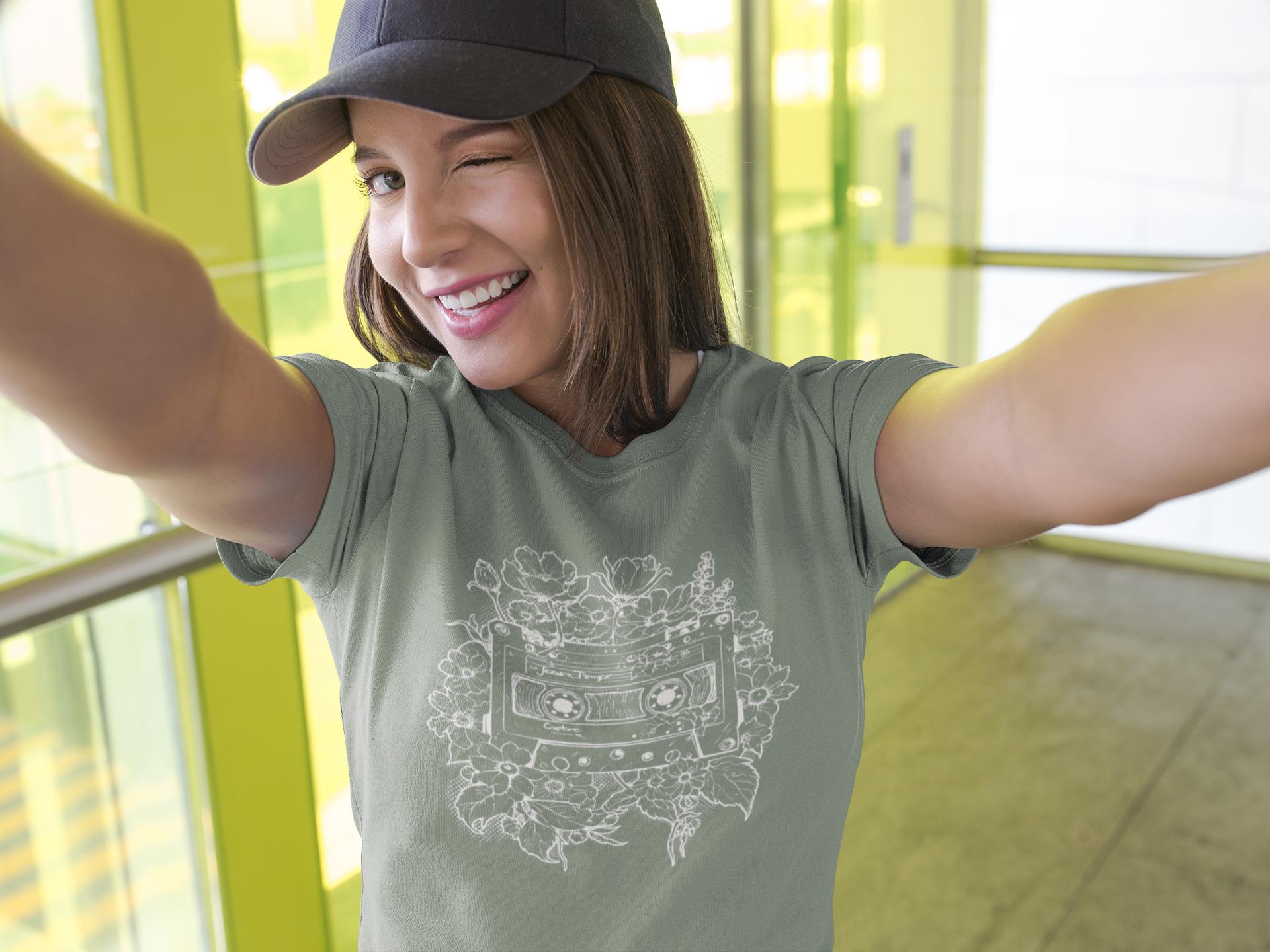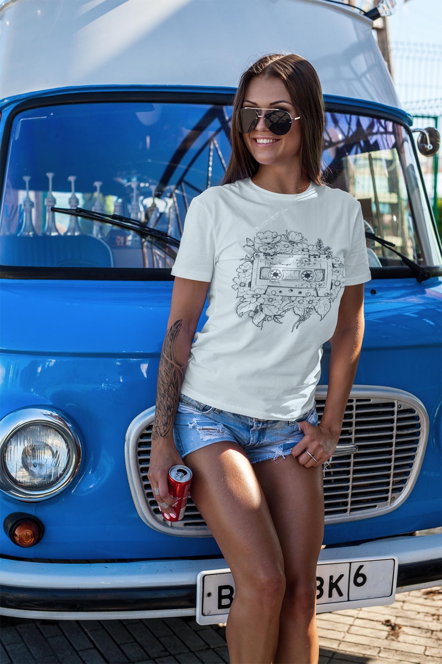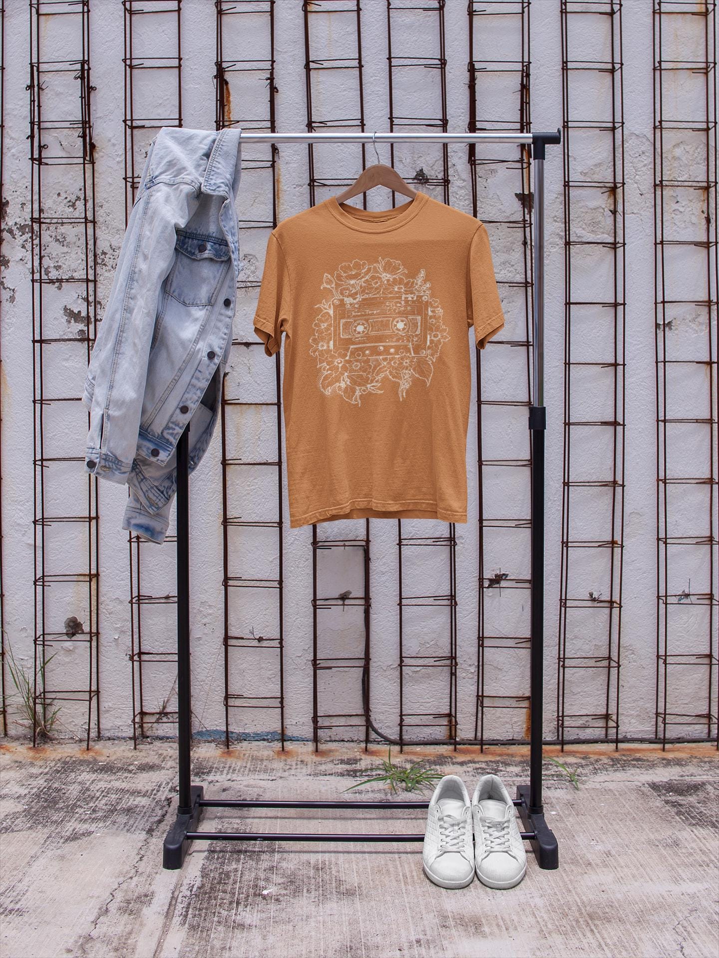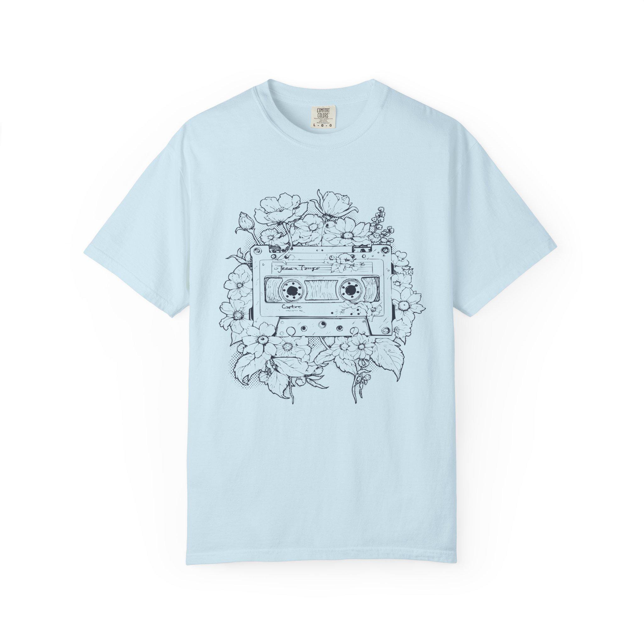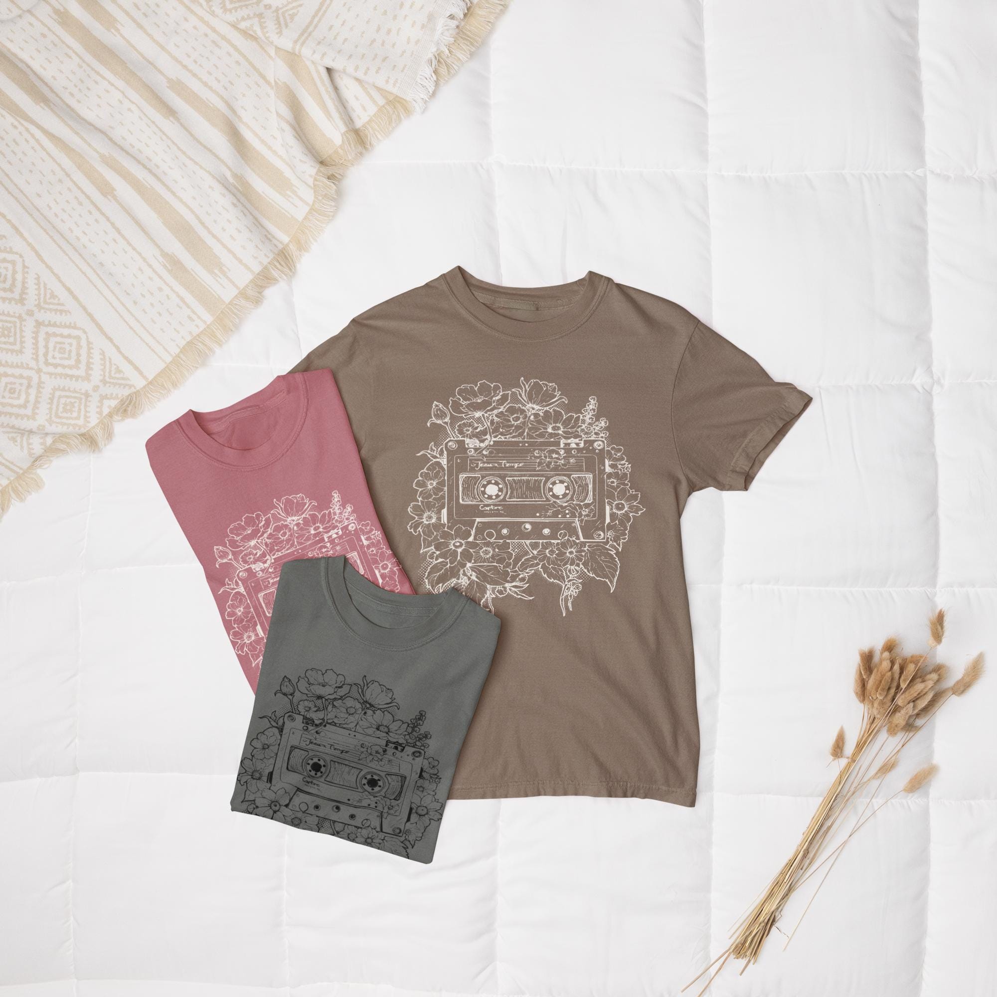 The front illustration features an ink-line cassette tape wrapped in wildflowers, a quiet nod to handmade playlists, rewound love songs, and the slow magic of music shared on purpose. The washed, muted color gives it that lived-in vintage tone, while the heavyweight 100% ring-spun cotton settles naturally into your daily rhythm.