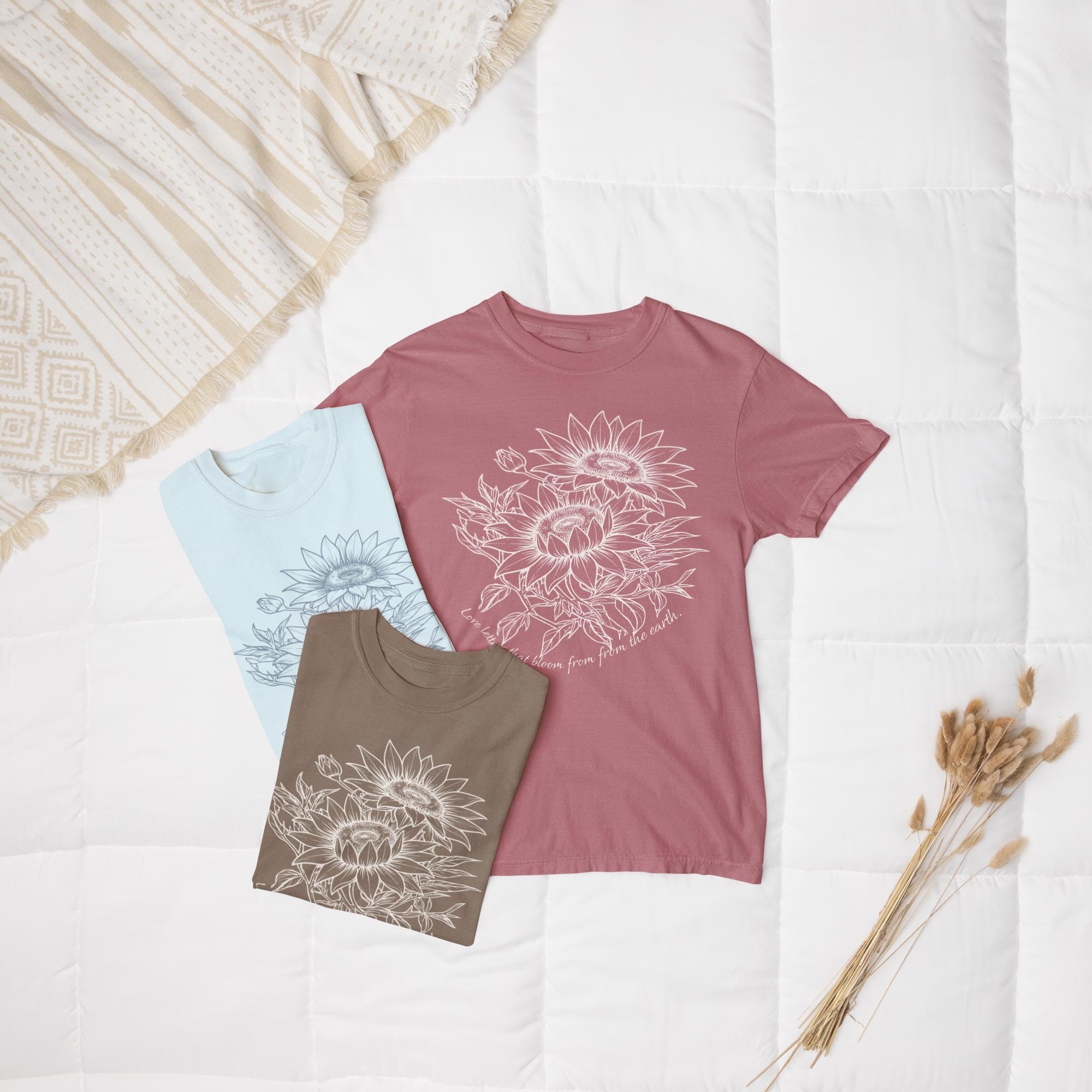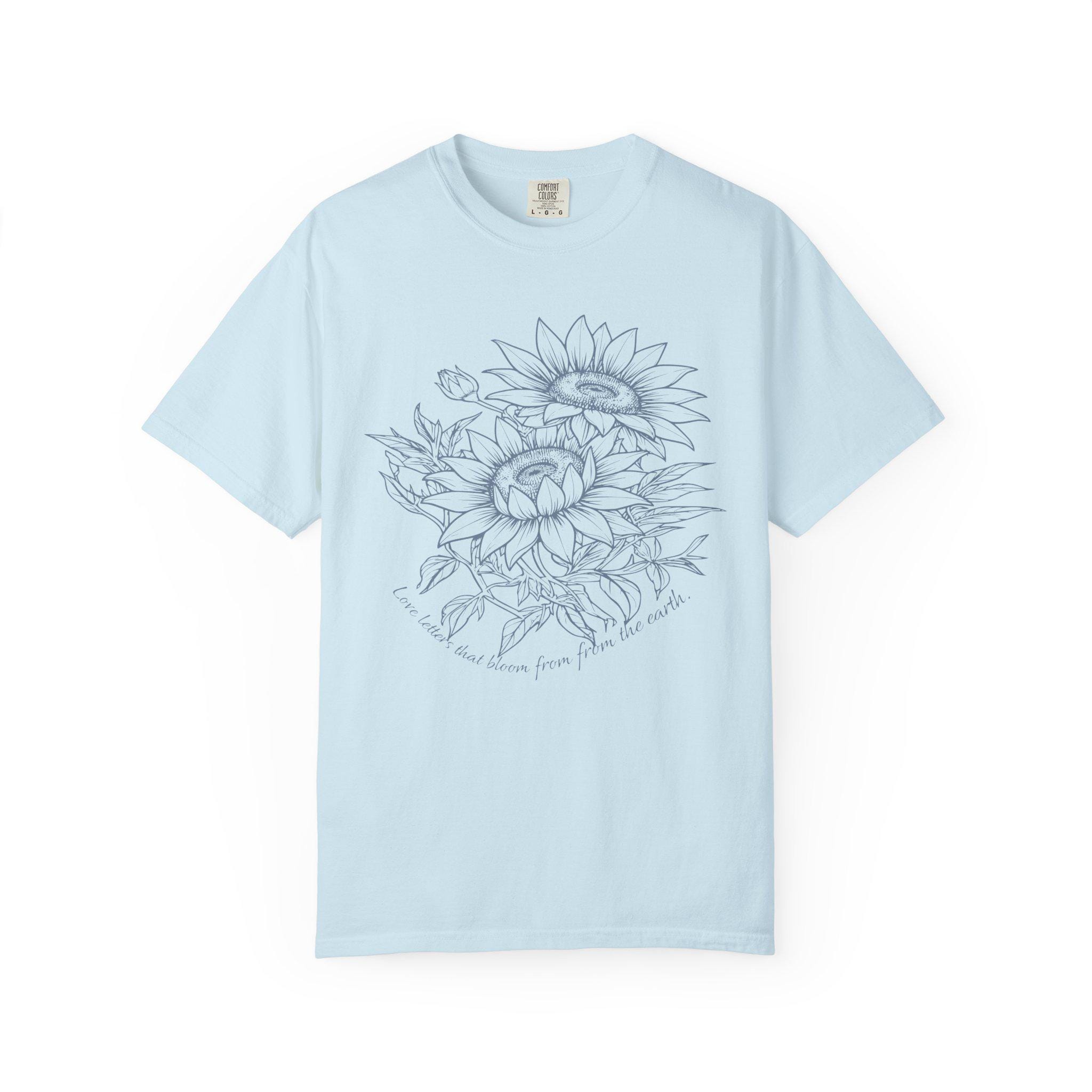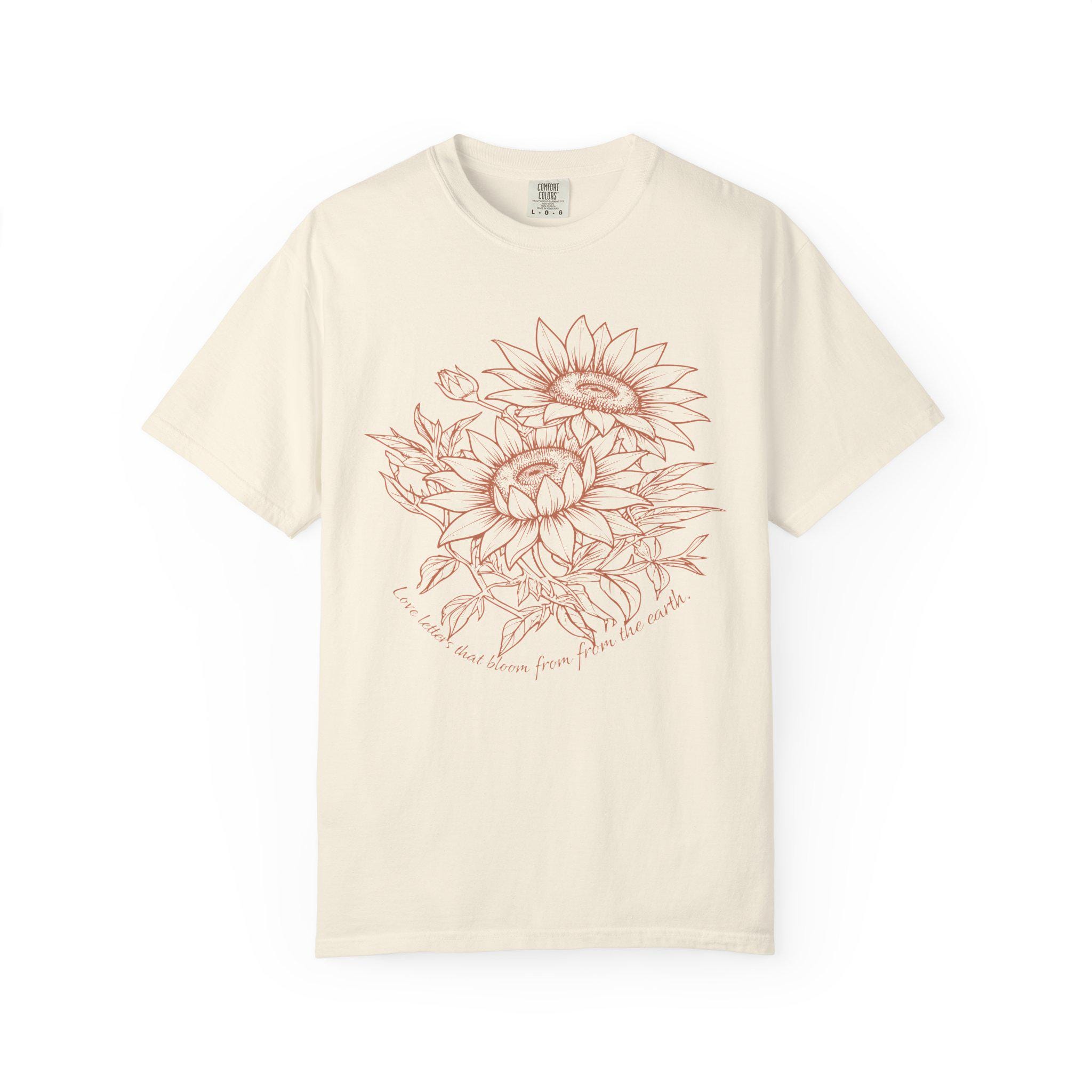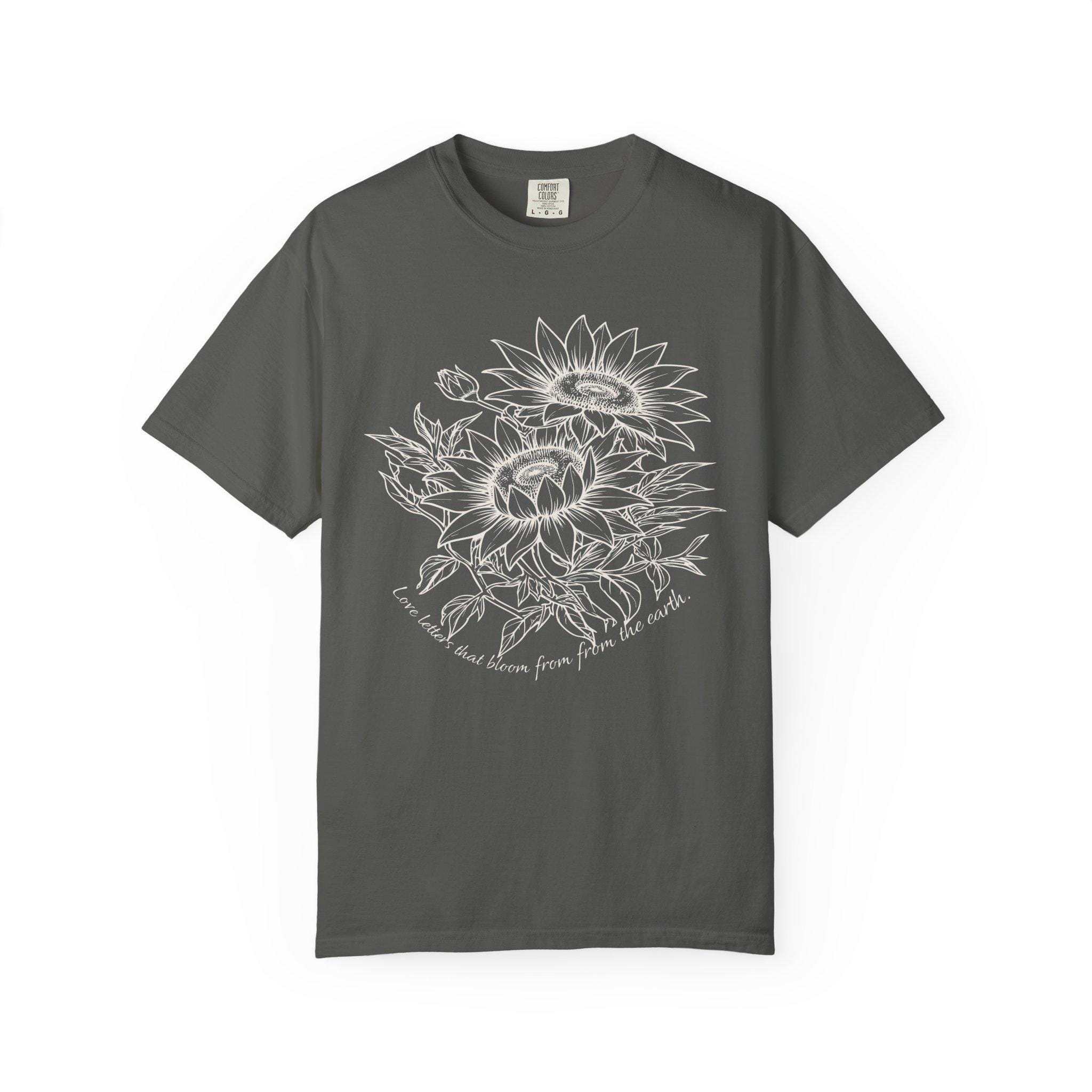 Soft, garment-dyed tee with a hand-drawn sunflower sketch that feels like an afternoon in a quiet garden. The heavyweight cotton settles into a relaxed silhouette that breathes and softens with wear. Sunflower lines in warm ink sit slightly faded against the dyed fabric, giving a lived-in, vintage sketchbook look. Wear it on slow mornings with coffee, at plant-swap meetups, or layered under a flannel for cooler evenings — it moves through a life of gentle routines and small celebrations.