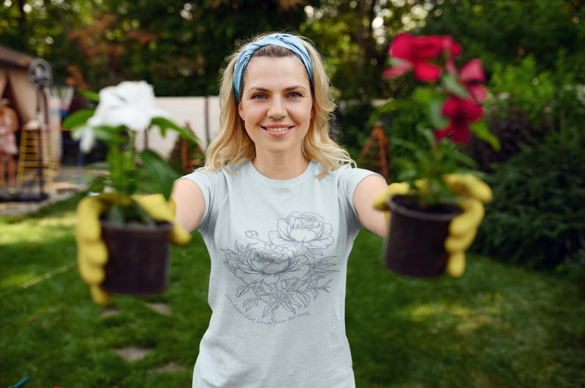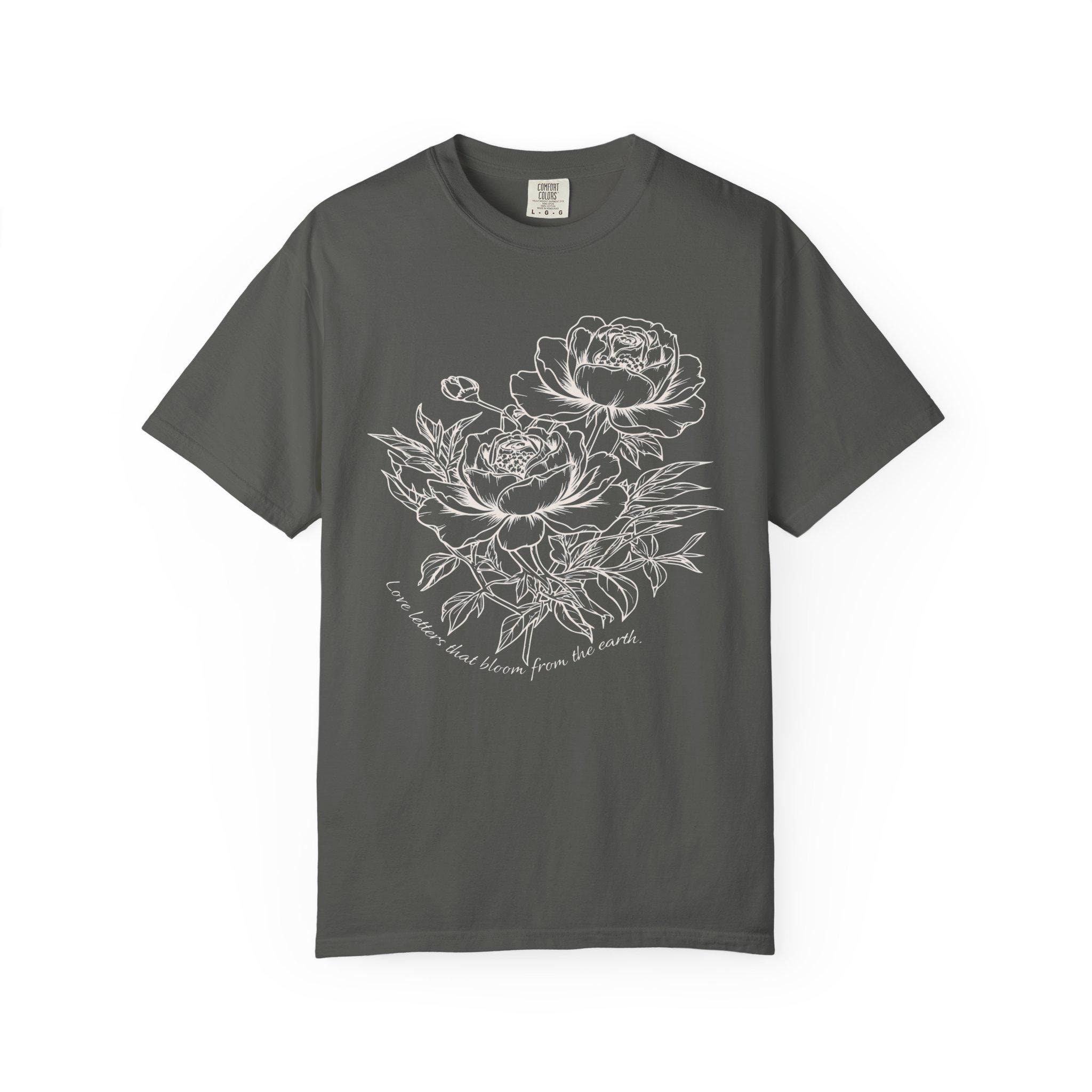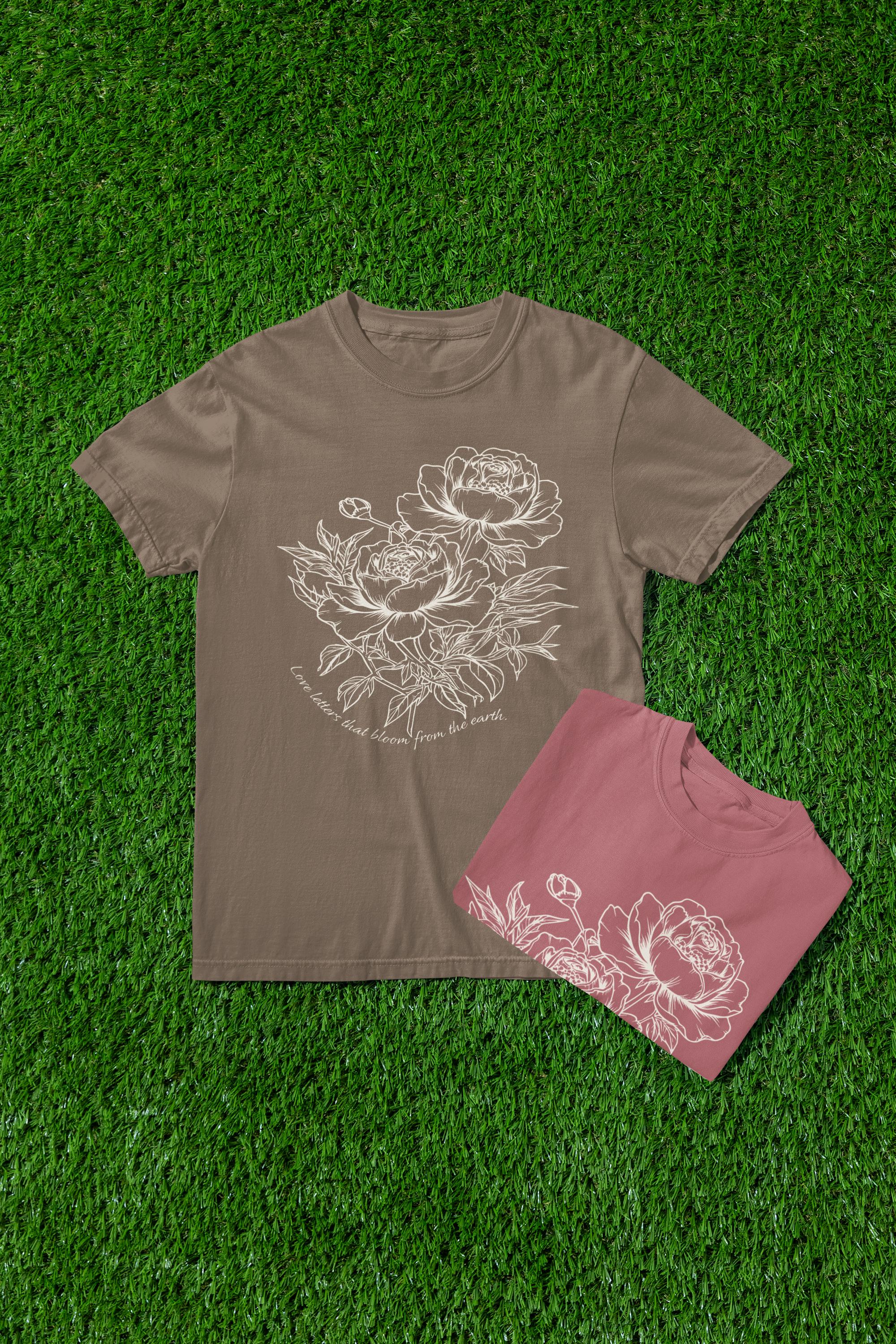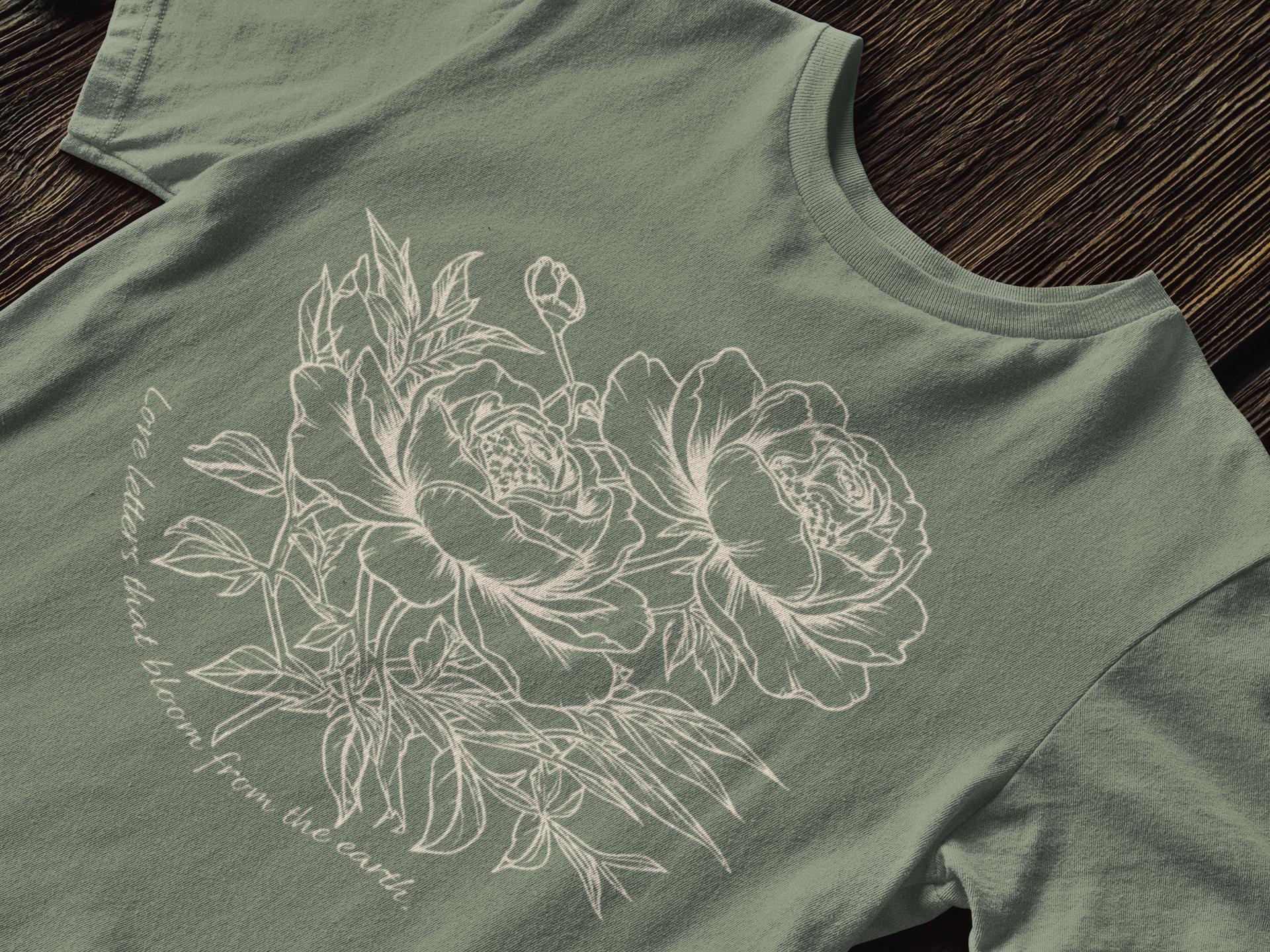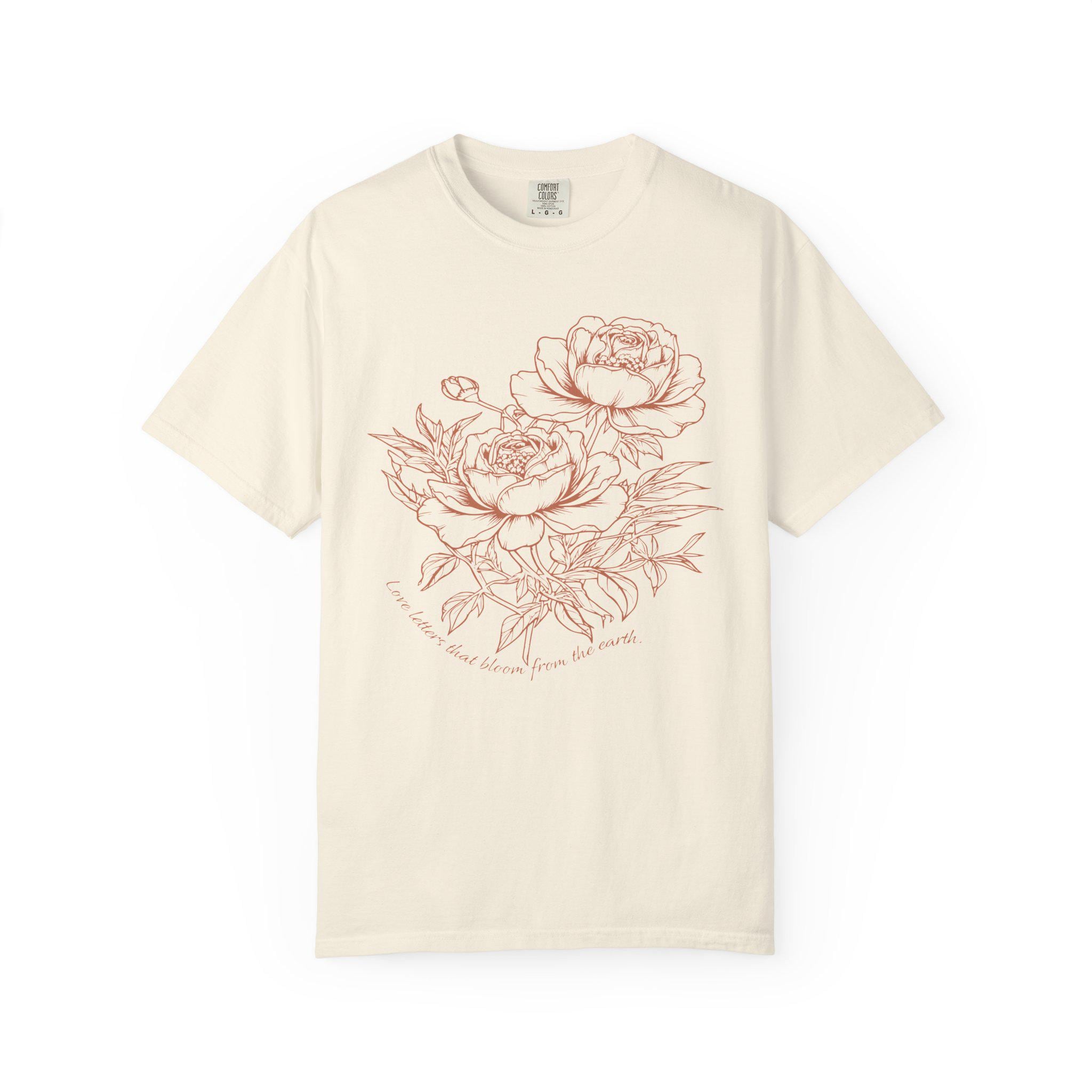 This soft, garment-dyed tee features a delicate hand-drawn rose line illustration printed across the chest, paired with the quiet phrase “Love letters that bloom from the earth.” Rendered in muted cream and warm rust ink, the floral sketch carries a vintage, sketchbook feel that softens and deepens with every wash.