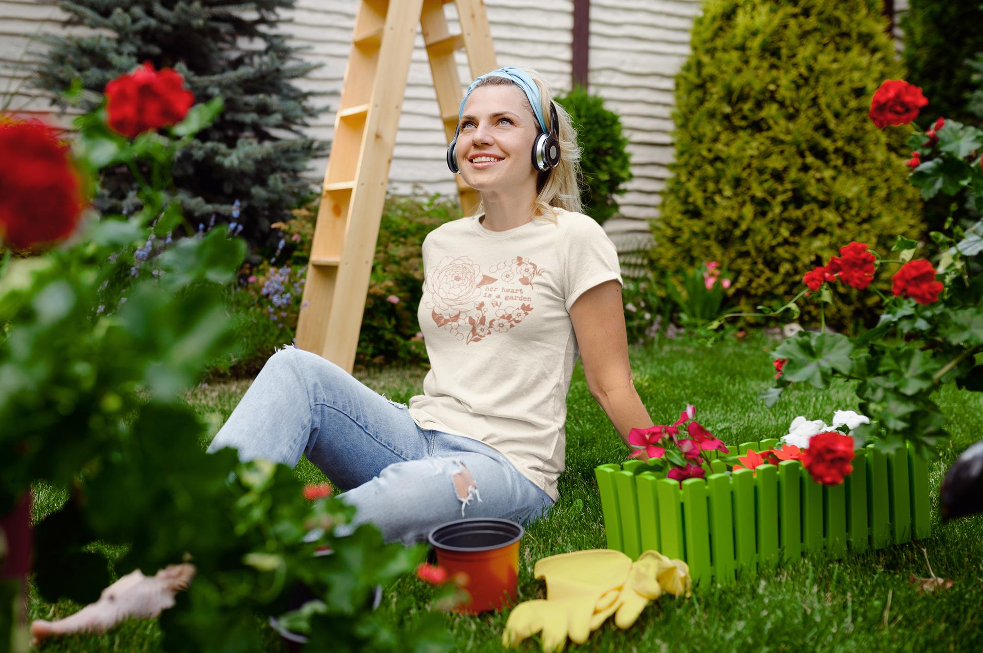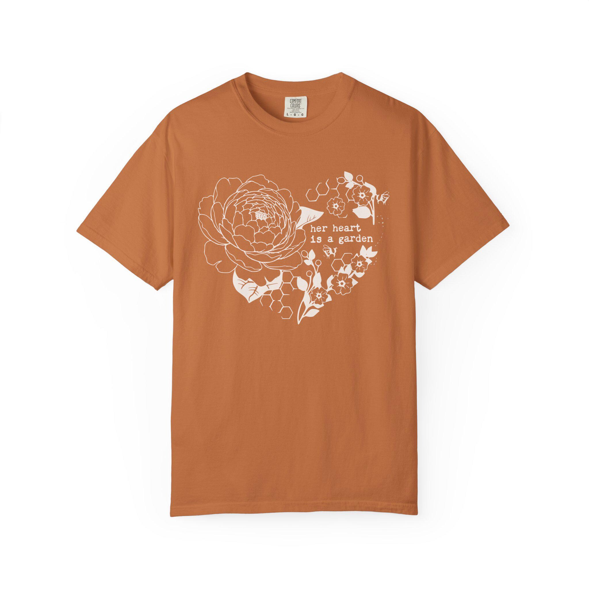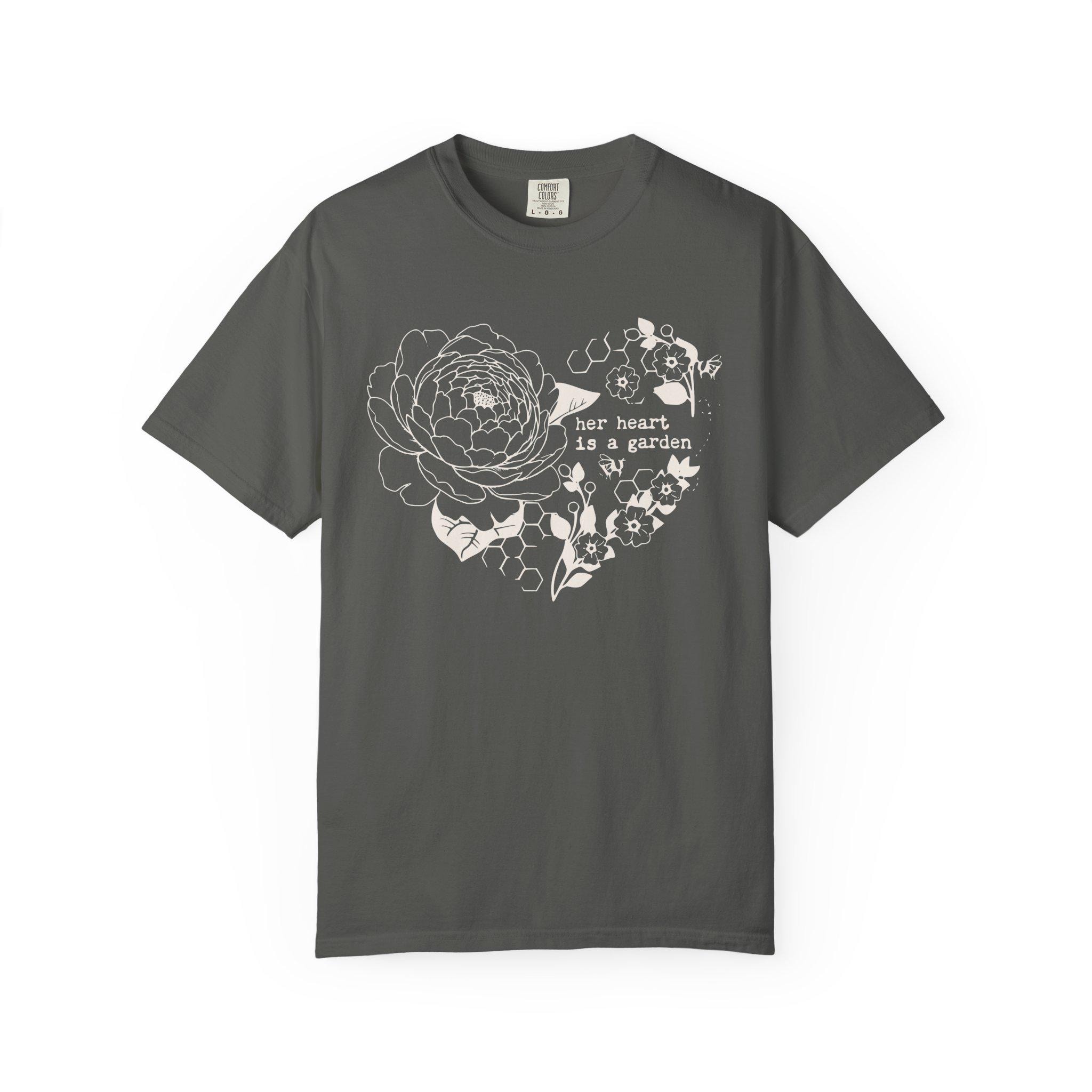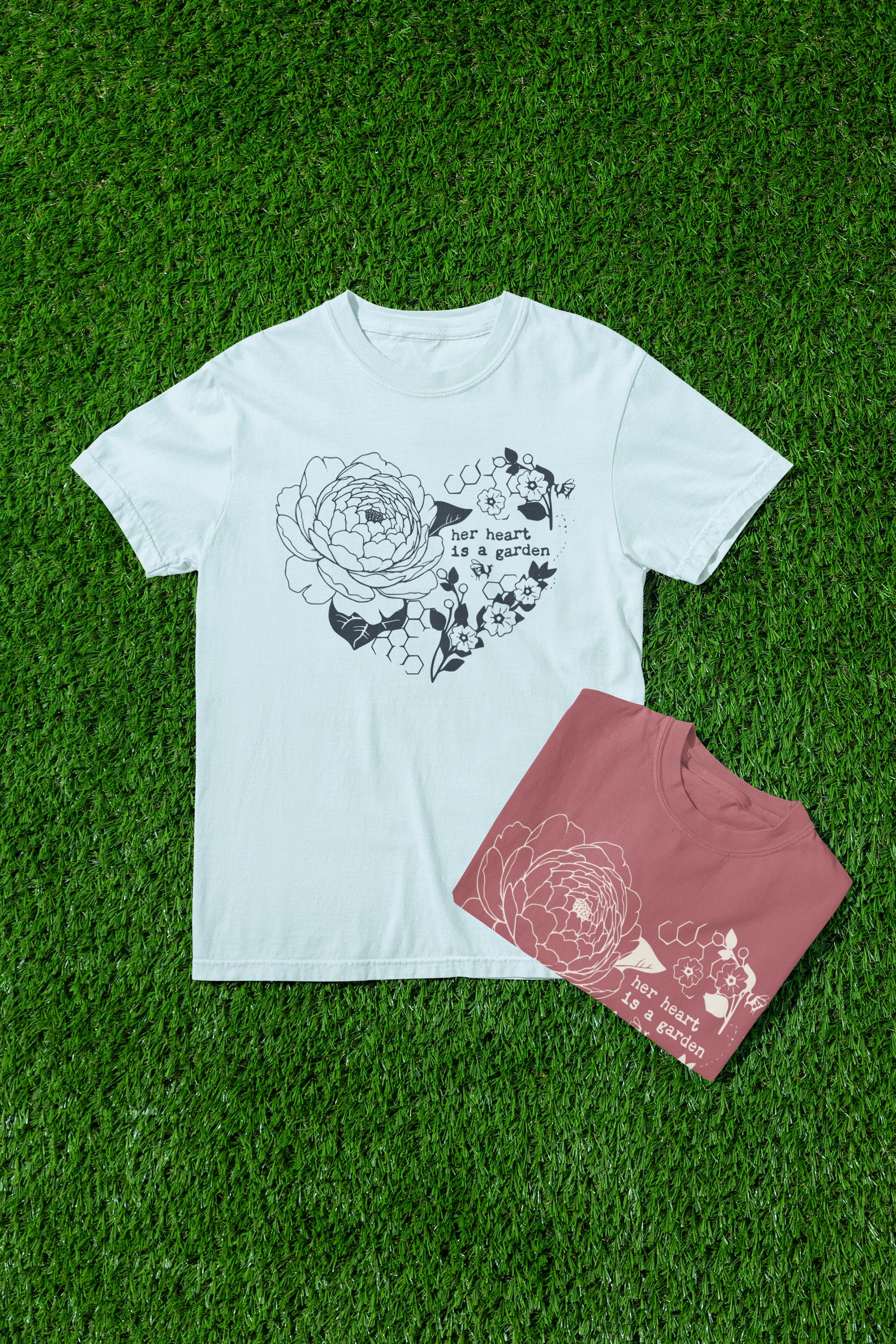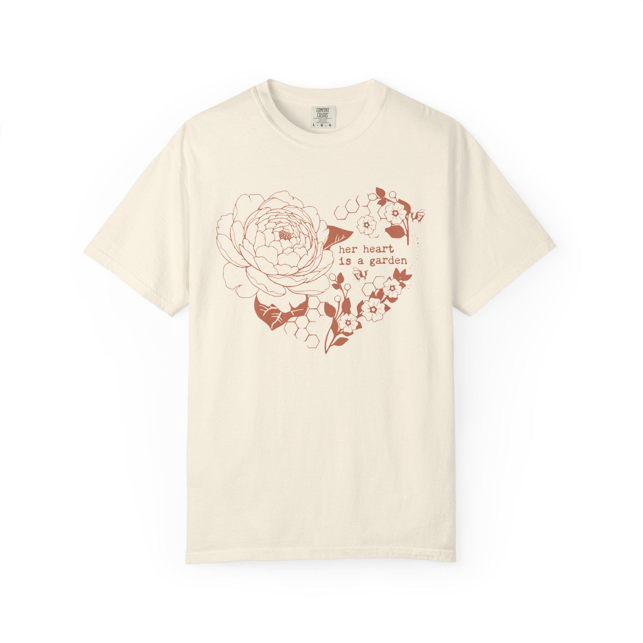 Soft, lived-in comfort meets gentle floral storytelling. This garment-dyed tee features a hand-drawn heart made of peony blooms and leaves, with the tender line “her heart is a garden” woven into the design. The muted, earthy print sits on a transparent honeycomb background that looks like it’s been worn and loved from day one. It settles easily into quiet mornings with coffee, long walks through neighborhood gardens, or slow afternoons arranging cut flowers. Lightweight but substantial, the shirt’s relaxed silhouette feels like an easy companion — something you reach for when you want to feel grounded, calm, and quietly expressive.