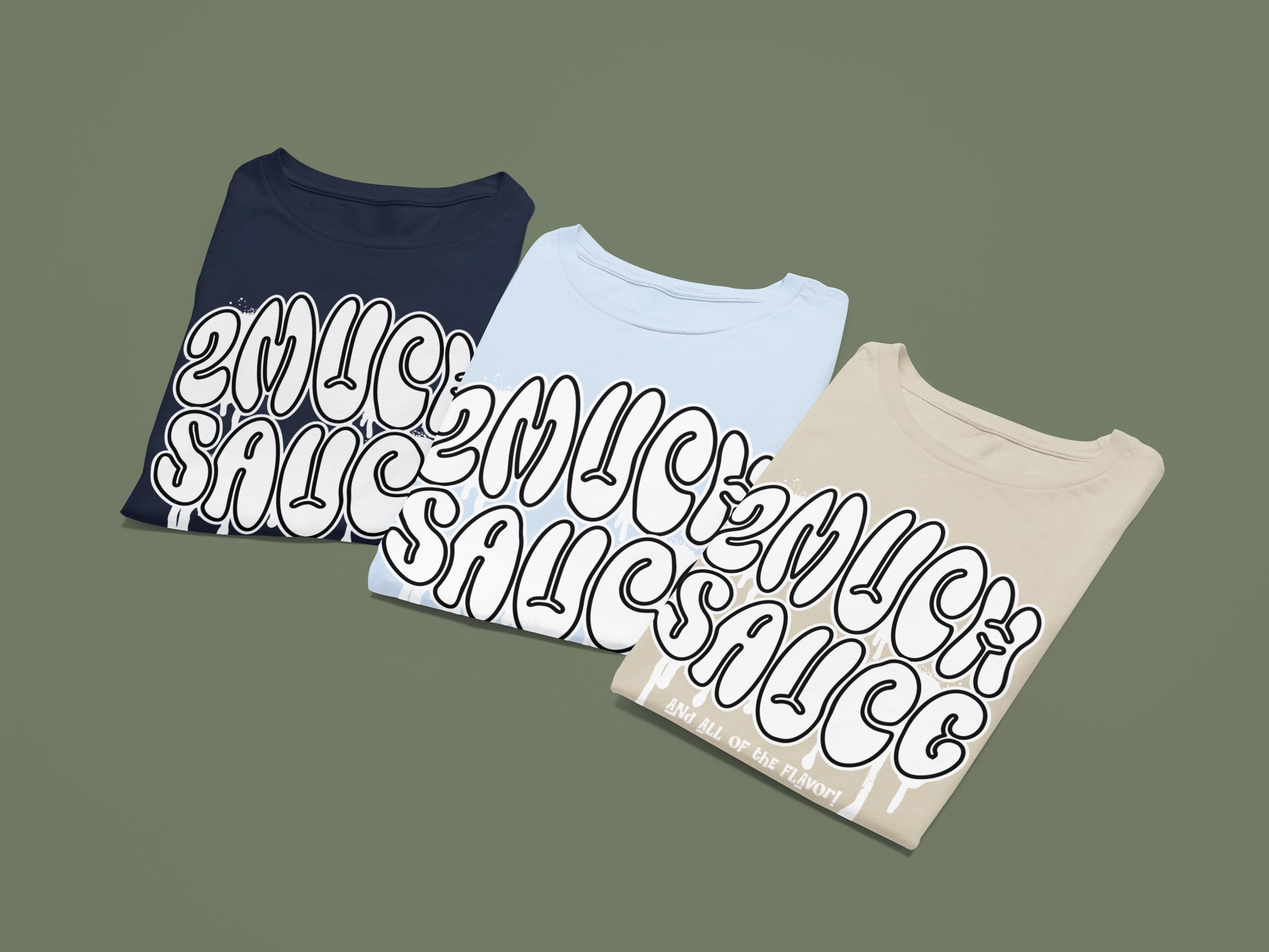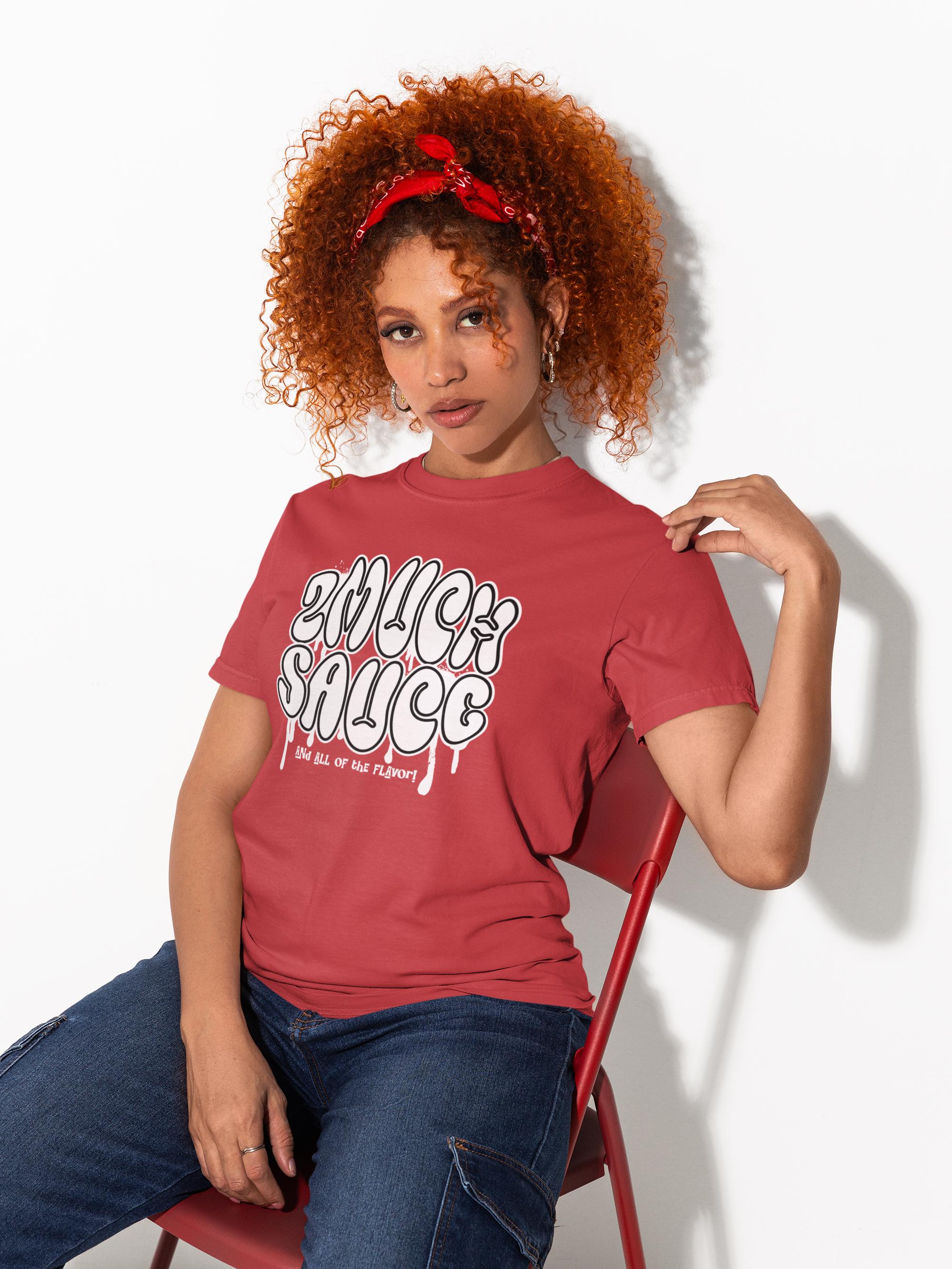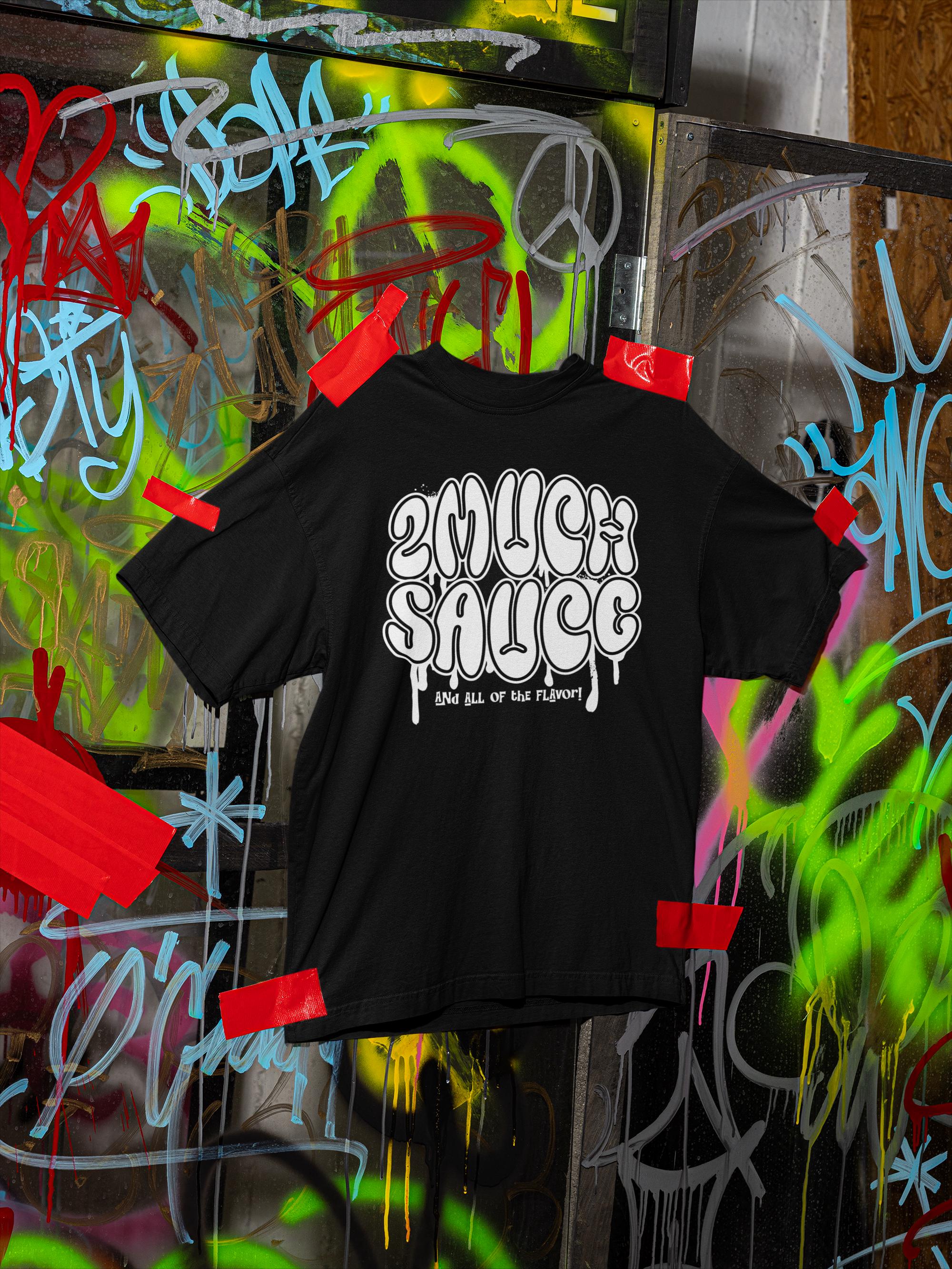 The 2 Much Sauce T-Shirt is made for those who walk in confidence and leave a little extra flavor everywhere they go. Featuring bold, drippy lettering front and center with the tagline “And all of the Flavor” underneath, this tee delivers unapologetic attitude with clean streetwear style.